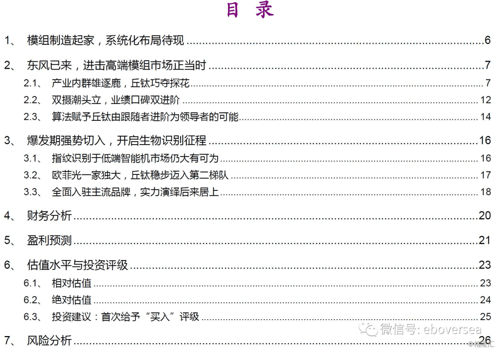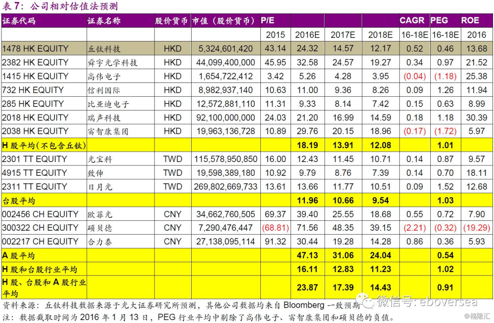 在A股上市,公司手机照相模组主要竞争对象,同时指纹识别模组出货量全球第一的欧菲光(002456 CH EQUITY);以指纹识别模组和手机照相模组作为基本的产品的硕贝德(300322CH EQUITY);以及同样指纹识别模组全球出货位于前列的合力泰(002217 CH EQUITY)。