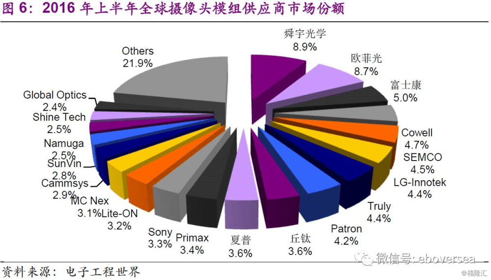 摄像模组封装环节的技术上的含金量及准入门槛较低,属资本密集型和人力密集型行业,便也决定了产业内群雄逐鹿的竞争格局。全球摄像头模组市场呈现出集中度低,市场占有率分散的特征,2016年上半年舜宇光学市占率达8.9%,持续卫冕,欧菲光则以8.7%的市占率紧随其后,而丘钛科技亦跻身前十,夺得3.6%的市场份额。