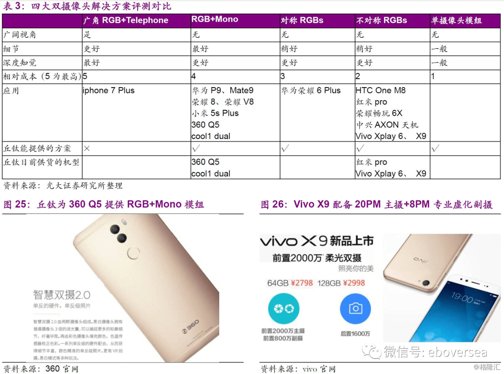 目前大陆具备双摄量产案例的模组厂商仅有舜宇、欧菲光及丘钛这三家。舜宇为华为P9、荣耀8等机型提供双摄模组,欧菲光则借助红米pro实现双摄量产。丘钛目前已为360Q5及cool1dual独家供应双摄模组,且也是红米Pro、VivoXplay6、X9的核心供货商,成功实现“RGB+Mono”及“不对称RGBs”两套双摄解决方案的量产,客户资源及技术实力可见一斑。
