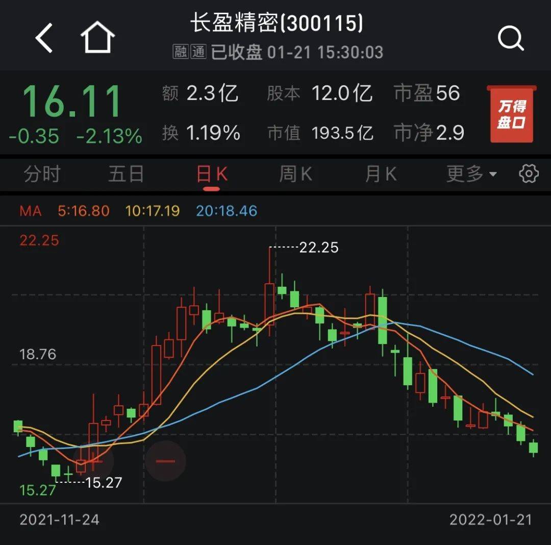 2022年以来长盈精密股价持续下跌,累计跌幅达18.80%,最新收盘价16.11元/股。