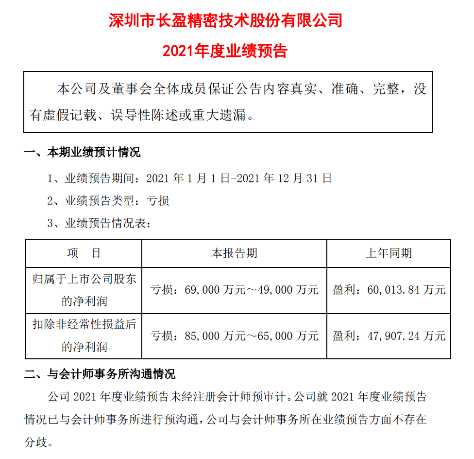 谁曾想,在新能源汽车快速地发展的2021年,“已取得了多家新能源汽车客户的供应商资格”的长盈精密居然预亏“4.9亿至6.9亿”。